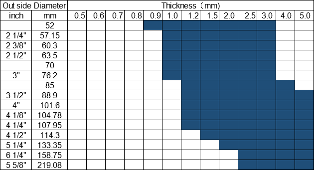 | Đường kính ngoài (mm) | Độ dày (mm) | Chiều dài (mm) | |