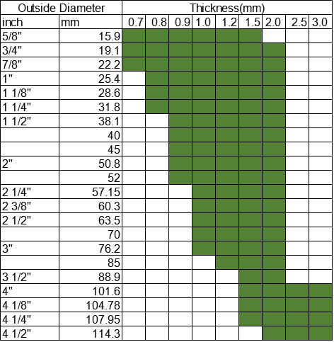 | Đường kính ngoài (mm) | Độ dày (mm) | Chiều dài (mm) | |
